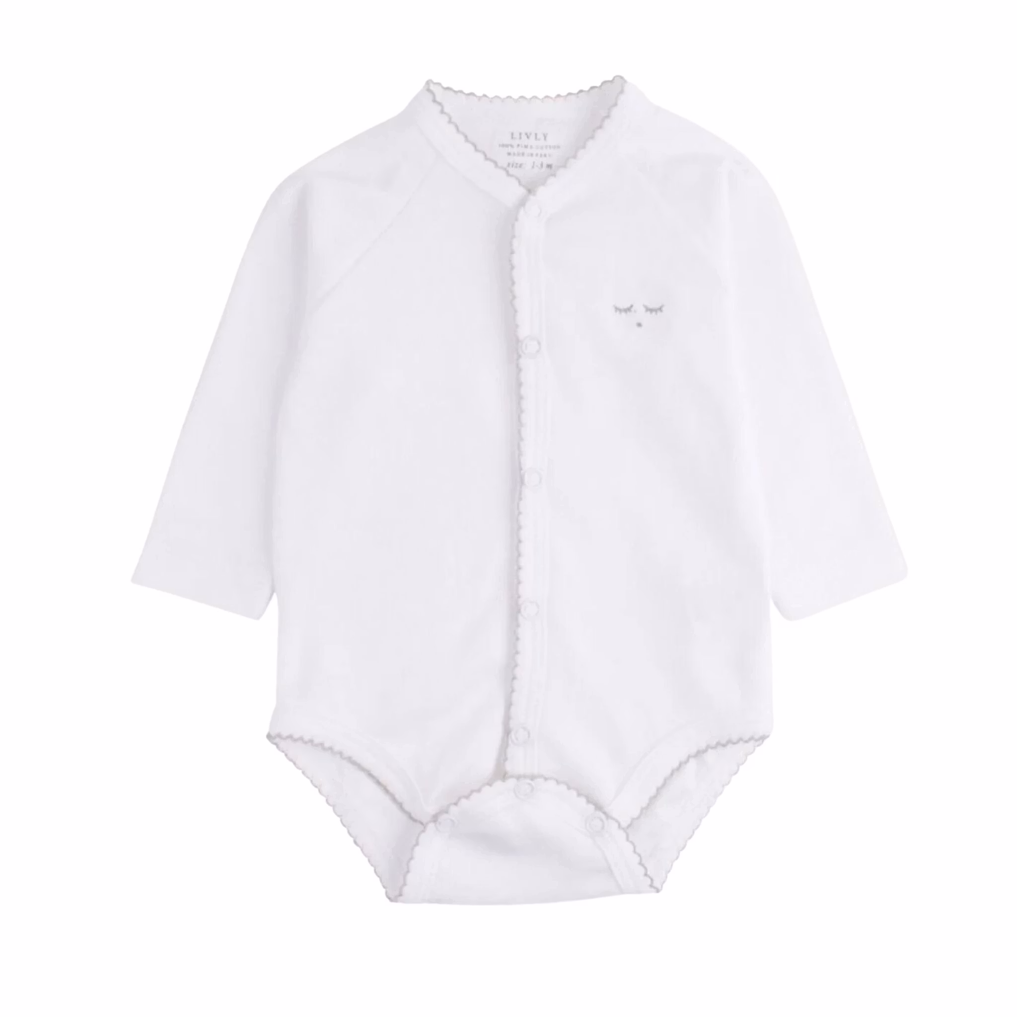 Klä din baby i LIVLYs full snap body med knäppning fram. Långa ärmar, nickelfria knappar, broderad kant & logo. Tillverkad av 100% Pima Bomull.